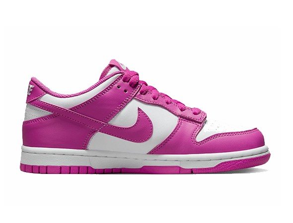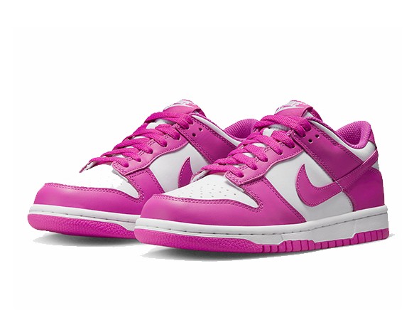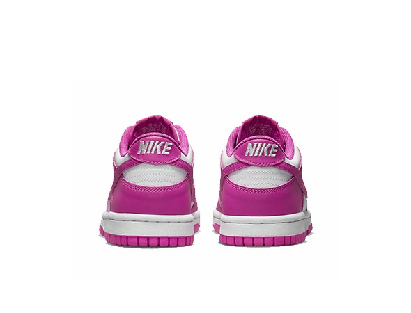 Details: Fake Nike Dunk Low GS "Active Fuchsia" comes in only two colorways, fuchsia and white. The base and midsole feature white. The overlay is covered in fuchsia. Also the Swoosh, laces, lining and outsole are all in the same color as the overlay.
