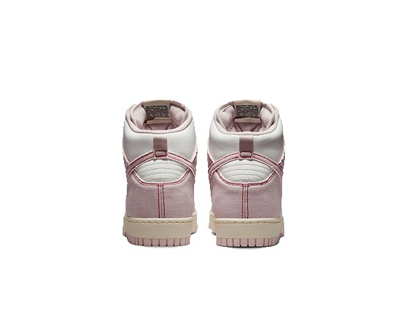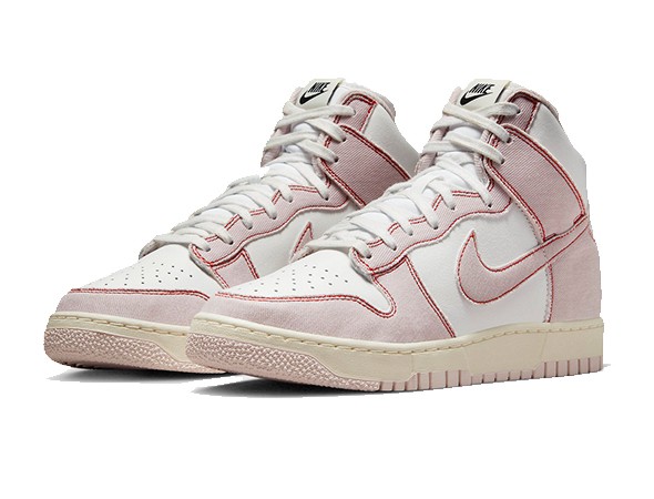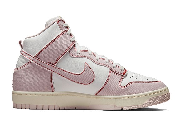 Details: The base of this Replica Nike Dunk High features white leather, while the overlays and Swoosh use a unique pink denim. Red stitching outlines the entire overlay. A distressed midsole and pink rubber outsole complete the design.