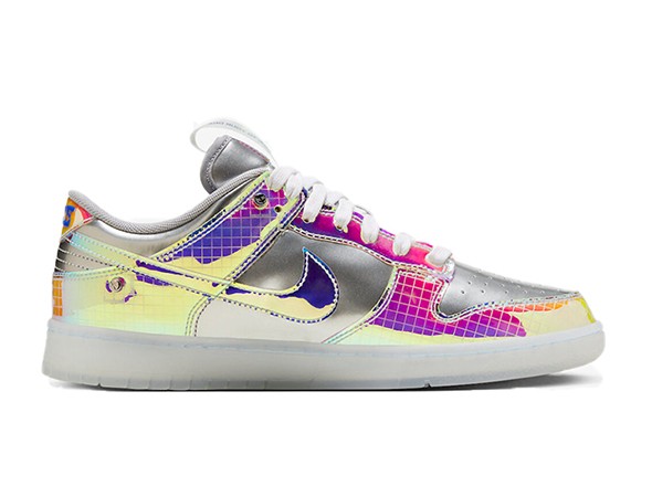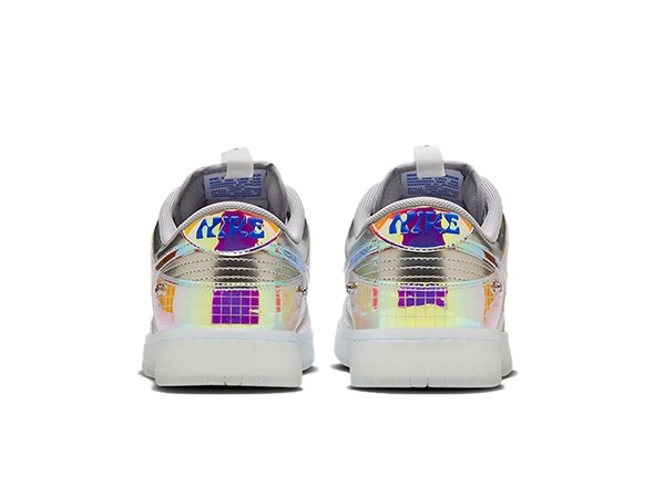 Details: Fake Nike Dunk Low “Be True” boasts an enchanting Metallic Silver patent leather base that elegantly envelops the toe box, side panels, and collar, while the "Be True" inscription adorns the tongues and insoles.