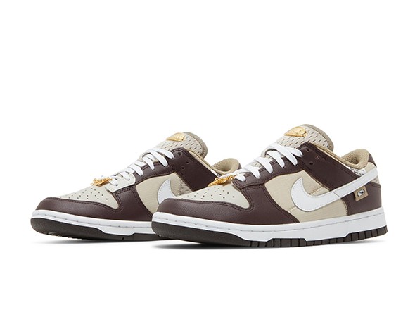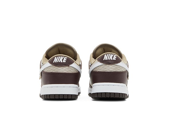 Details: The upper is made of anti-nylon and leather material, and this Fake Nike Dunk Low uses mostly brown tones. While the Swoosh, laces and midsole use white. The toe cap has some mesh, which improves breathability. Notable is a gold metal emblems with Nike Swoosh on the tongue and a chain with Nike lettering on the laces.