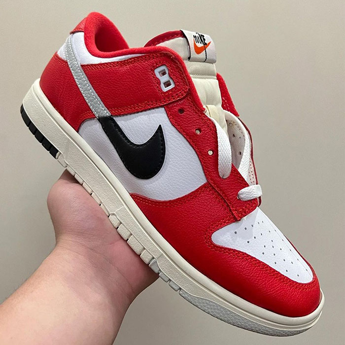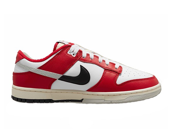 Details: Made of leather, this Replica Nike Dunk Low "Chicago Split" comes in white for the base, while the overlay features university red. Swooshes are made of black and grey stitching. The same design is also applied to the rubber outsole.