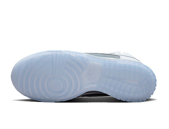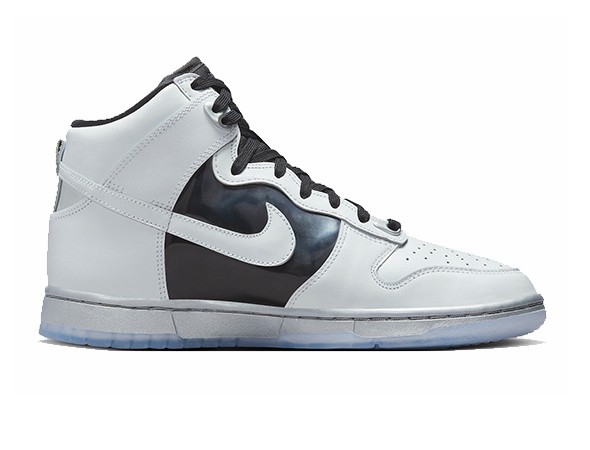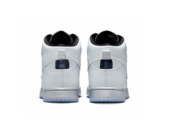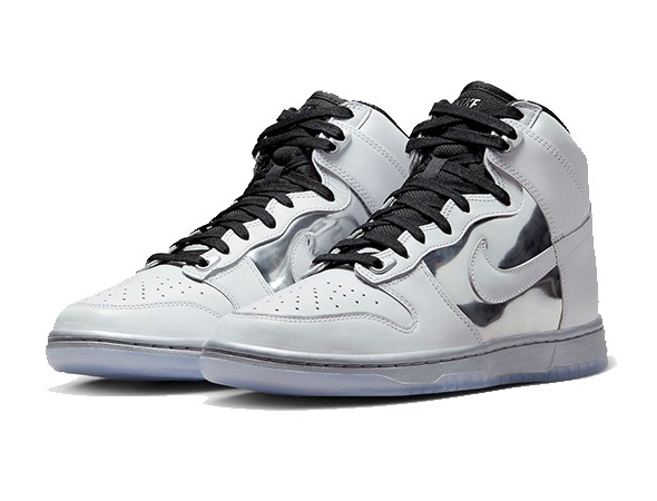 Details: Fake Nike Dunk High "Chrome" is mainly made of white leather. Reflective chrome finish is used on the sides. The laces, lining, and mesh tongue all come in black to contrast with the upper. Finally, the design ends with a metallic silver midsole and translucent rubber outsole.