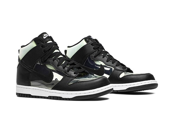 Details: The copy Nike Dunk High Comme Des Garcons "Clear" featuring a Black and Cream upper that has transparent PVC panels and toe area. The Nike Swoosh branding hits the tongue and sides, while “CDG” lettering is seen on the heels.