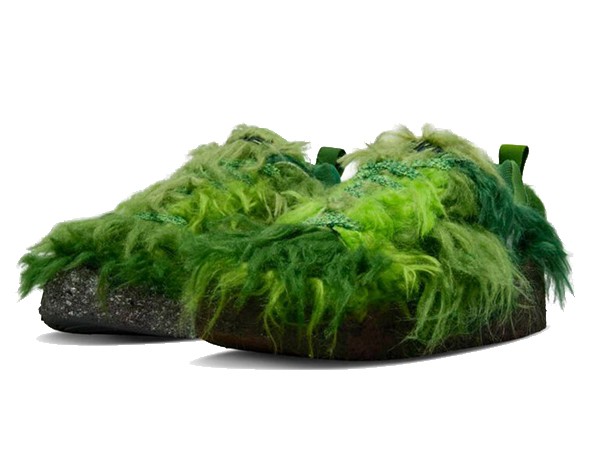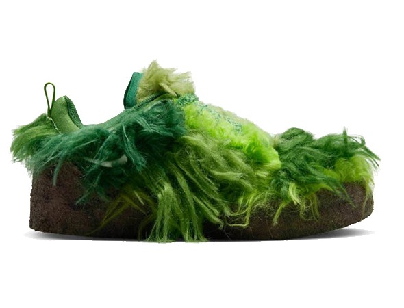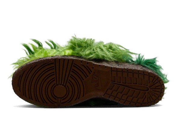 Details: Green shaggy faux fur accents the entire upper, this Reps Nike Dunk Low shoe is completely obscured by overgrown green foliage, giving it a Grinch vibe. Embroidered CPFM and Nike branding on the tongue.