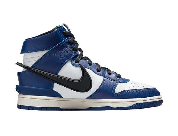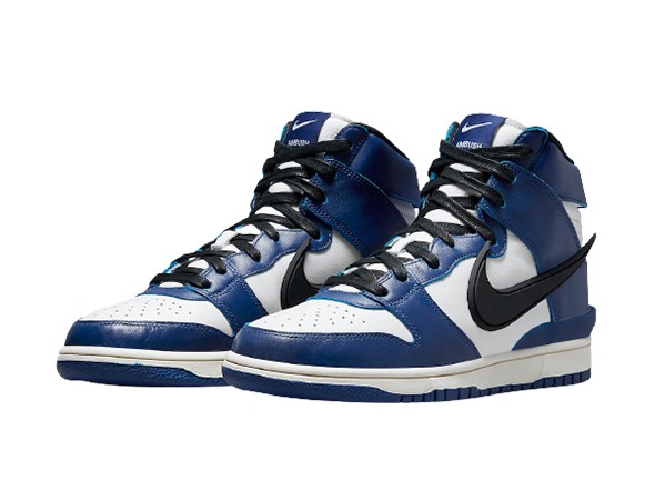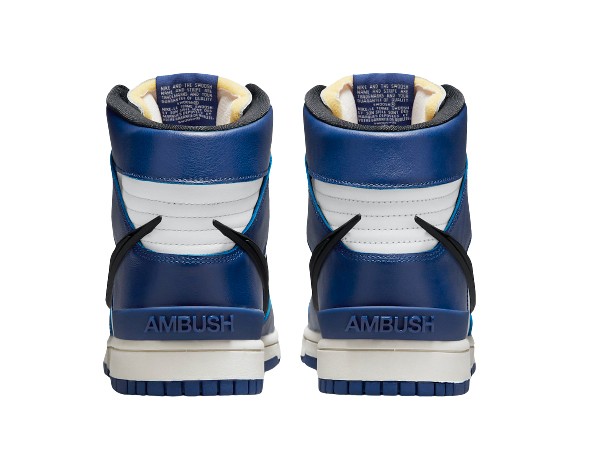 Details: This fake Nike Dunk High AMBUSH "Deep Royal" to feature a White leather upper with Royal Blue leather overlays and Black Swooshes extending beyond the heel.