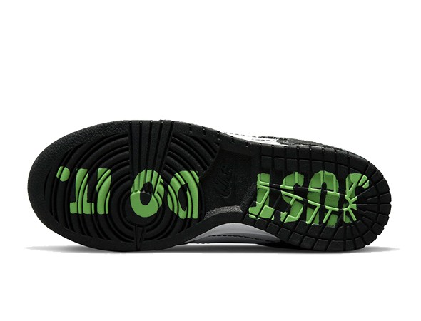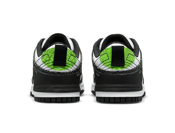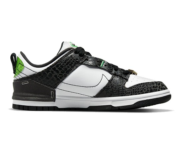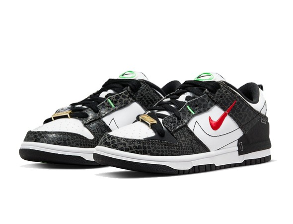 Details: This fake Nike dunk low shoes constructed in a White leather base, jersey mesh tongues with Green snakeskin overlays and “Dunk” Gold dubraes atop a White midsole with “Just Do It” stamped onto the Black outsole.