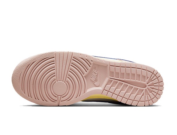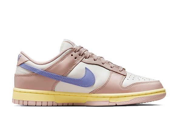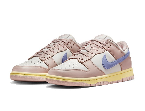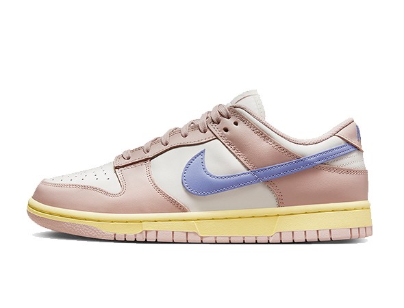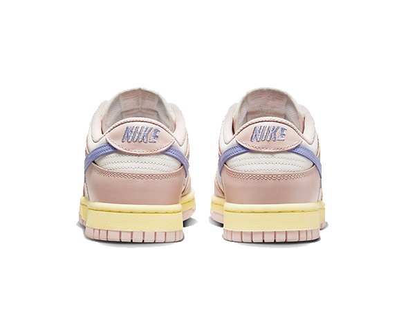 Details: The leather base of this fake Nike Dunk Low takes on a pale grey hue while the overlays have a soft pink exterior that matches the outsole and laces. The signature Nike Swoosh is dressed in vibrant lavender and Nike branding on the heel tab. The midsole has a yellow finish, giving the sneaker a vintage vibe.
