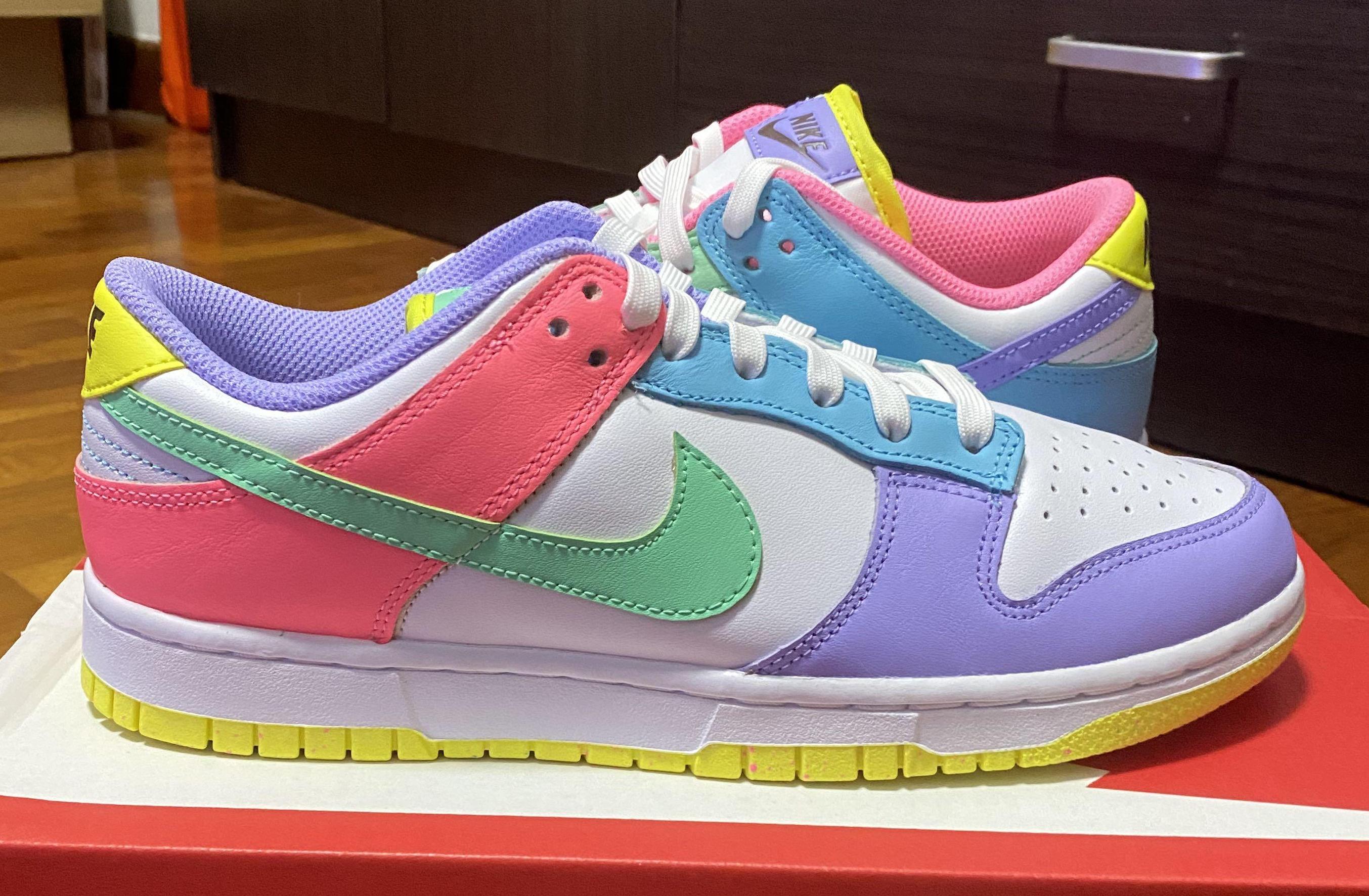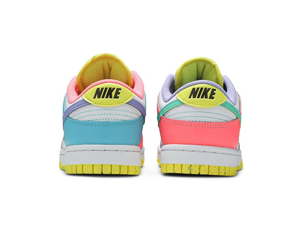 Details: This fake Nike Dunk Low "Easter" features a White leather base with pastel hues covering the overlays, Swooshes, tongue labels, heels, and inner lining. A White midsole atop a Yellow speckled rubber sole completes the design.
