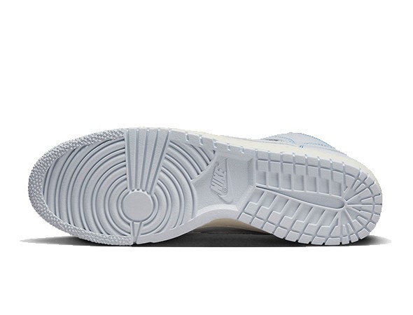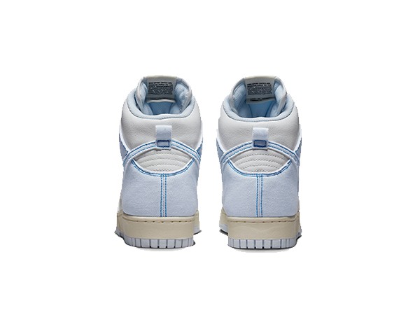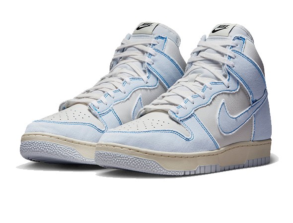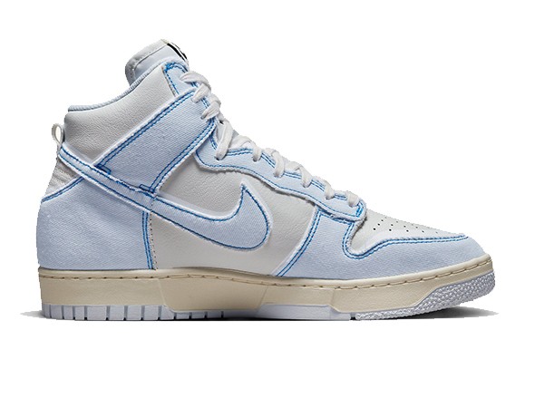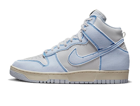 Details: This Fake Nike Dunk High features a White leather base with Light Blue denim overlays detailed with Dark Blue stitching. Black branded tongue tags and insoles atop an aged midsole and Light Blue rubber outsole completes the design.
