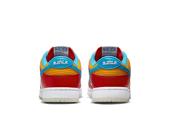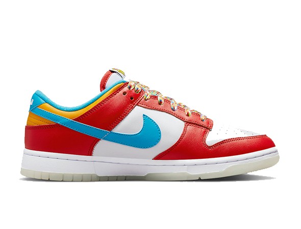 Details: This Fake Nike Dunk Low features a White leather base with Red overlays, Blue Swooshes and Tan collars. White continues on the tongues and rubber sole. But the highlight of this Dunk Low are Fruity Pebbles graphics and branding on the laces, insoles and tongue tags, respectively. The shoe also comes with extra laces housed in special co-branded packaging.