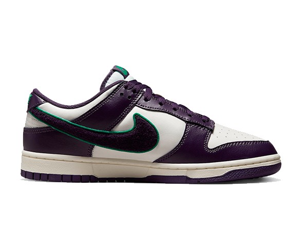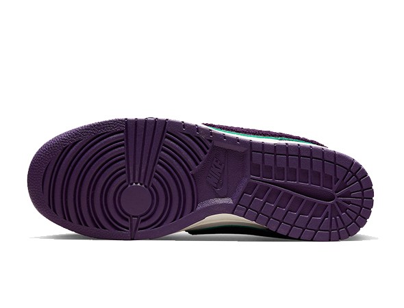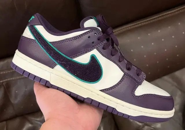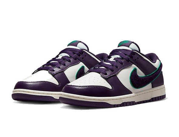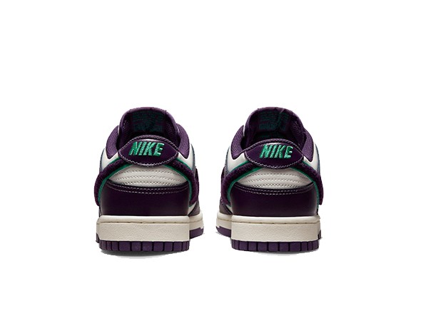 Details: This Fake Nike Dunk Low features a White leather base with Purple leather overlays highlighted with Aqua contrasting accents throughout. Chenille Swooshes on the sides atop a Sail midsole and Purple rubber outsole completes the design.