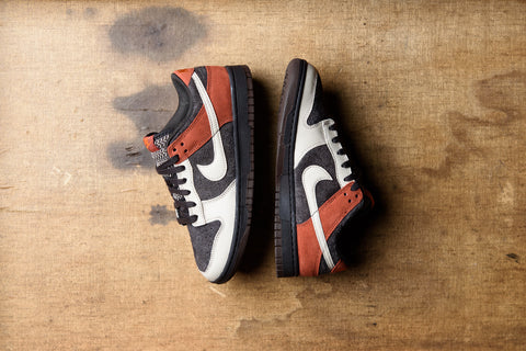 Details: Fake Nike Dunk Low "Red Panda" is made up of a variety of shades. The dark grey base uses suede material. While the overlay features leather, which consists of Sanddrift and Velvet Brown. Swooshes also come in Sanddrift. Rugged Orange appears on the tongue tab and heel tab, which is reminiscent of the red panda hue.