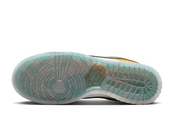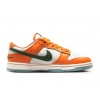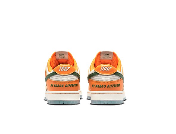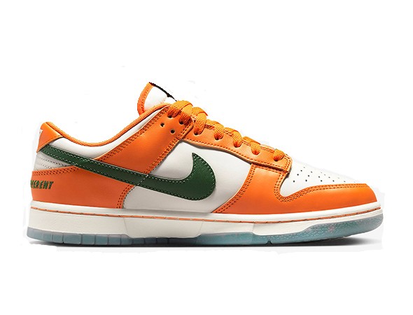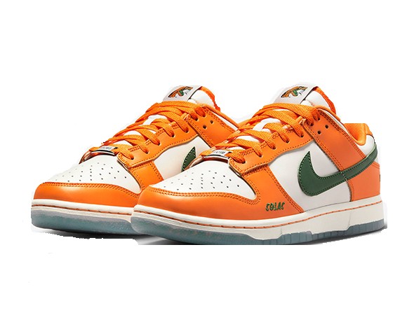 Details: Made of leather, the base and midsole of this Reps Nike Dunk Low are white, while the overlays, laces and lining are orange. At the same time, the green Swoosh can be seen. Grey outsole completes the design.