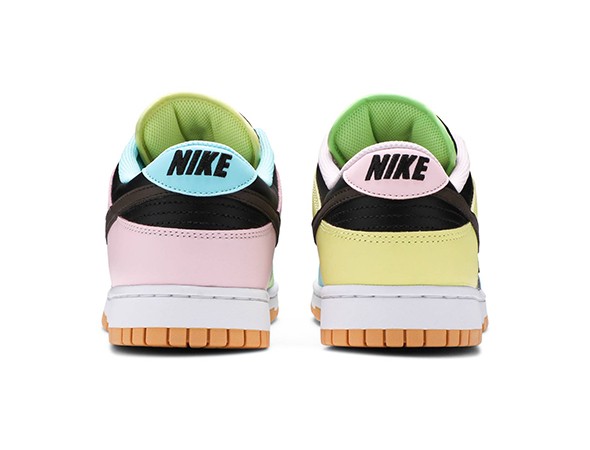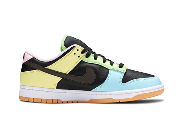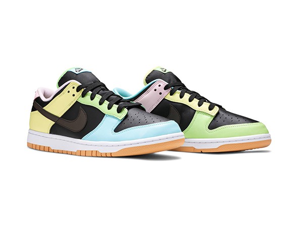 Details: The replica Nike Dunk Low SE "Free 99-Black" applies mismatched color blocking to the vintage hoops shoe turned streetwear staple. Both the left and right shoe feature a black leather base on the upper, supported by a crisp white midsole and pale orange rubber outsole. While the overlays on each shoe are arranged in asymmetrical fashion, they draw from the pastel palette of powder blue, pink, yellow and line green hues.