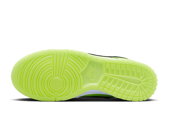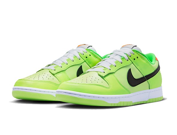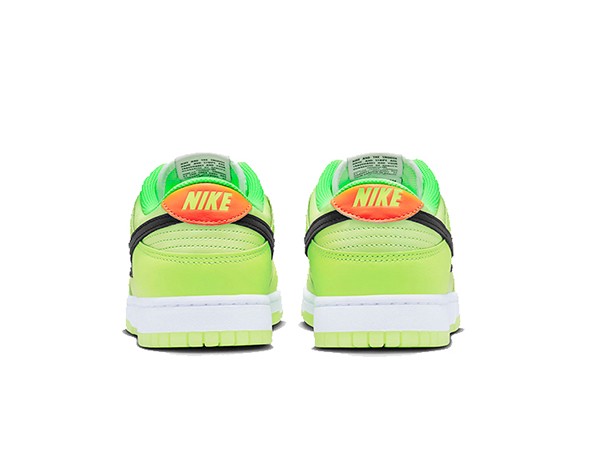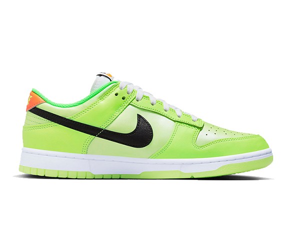 Details: Reps Nike Dunk Low "Glow in the Dark" mainly features venom green upper. A tonal rubber outsole matches it. The shiny base is paired with leather overlays. In addition, the tongue label and heel tab are finished in bright orange. Finally, the shoe is completed with black Swooshes. Of note is the reflective finish is used on the upper and rubber outsole.