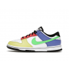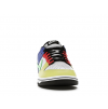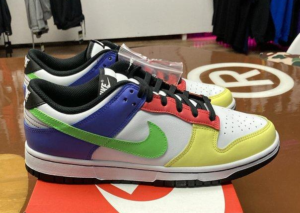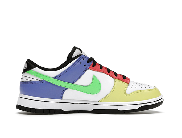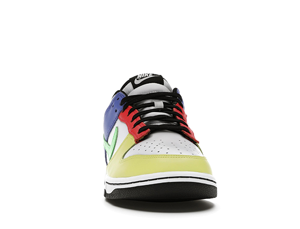 Details: This Nike women's Dunk Low "Green Strike" replica features a White leather base with multicolored tones in a mix of Yellow, Red, Green, and faded Blue used on the overlays. Black is used on the tongue labels, laces, sockliner, heels, and rubber outsole. Finishing touches includes White branded tongues and heels, Volt insoles atop a White midsole.