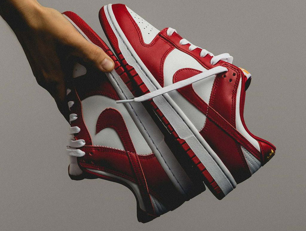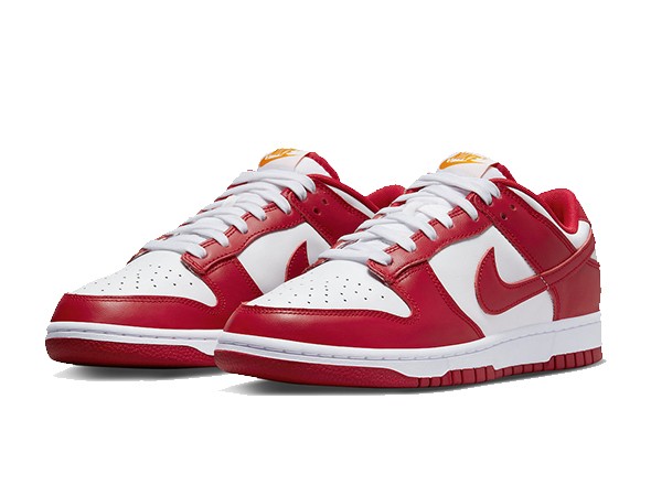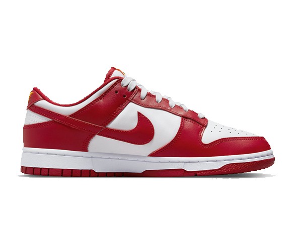 Details: Featuring a leather upper, the base of this Reps Nike Dunk Low is White, while the overlays, Swoosh, lining and outsole use Gym Red. The yellow Nike logo on the heel and tongue stands out.