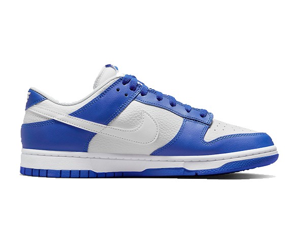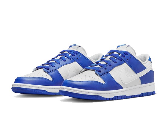 Details: Fake Nike Dunk Low "Kentucky Alternate" features a light grey tumbled leather base with blue smooth leather overlays and white Swooshes. The two-tone sole complements the upper.