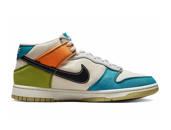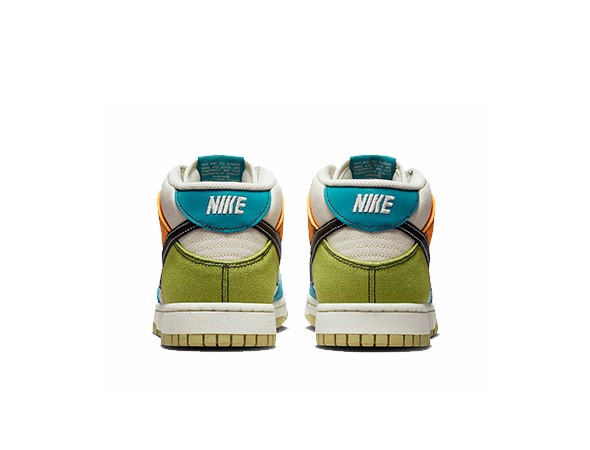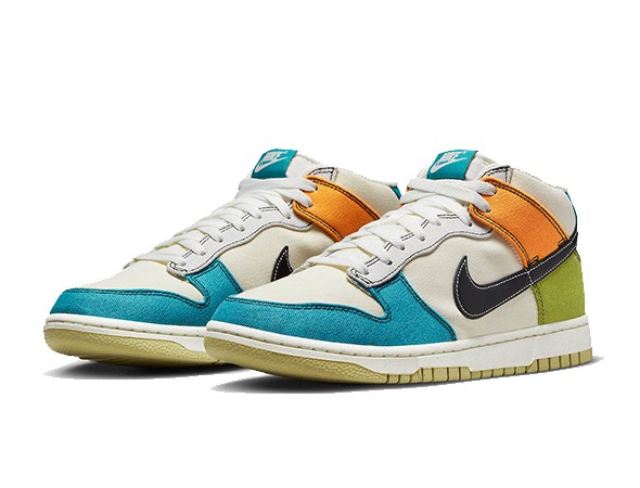 Details: The upper pf this Replica Nike Dunk Mid is made of canvas material, and the Swoosh features black leather. The base is pale ivory, and the overlays are rich in color, Mineral Teal, Moss, Alpha Orange, and Team Gold. The mesh tongue and lining also provide high breathability.