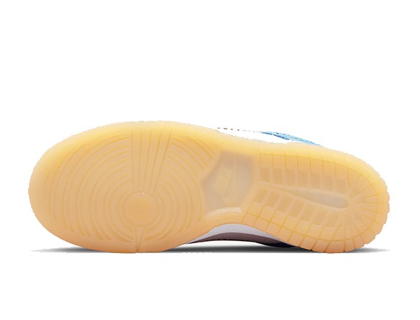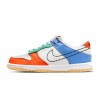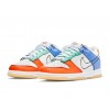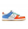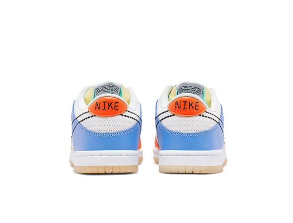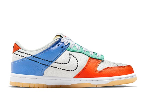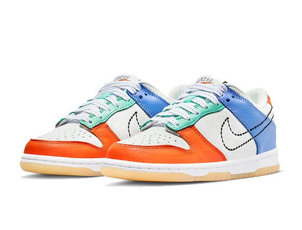 Details: Dressed in a White, Safety Orange, Green Glow, and Black color scheme. This Nike Dunk Low features a cracked leather base with colorful tumbled leather overlays. Other details includes stitched Swooshes atop a Gum translucent outsole.