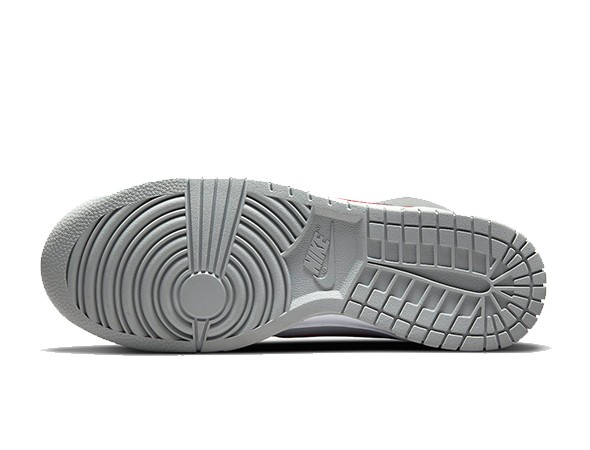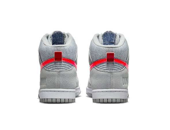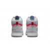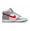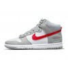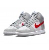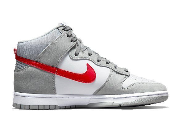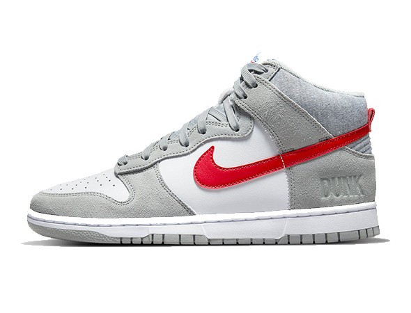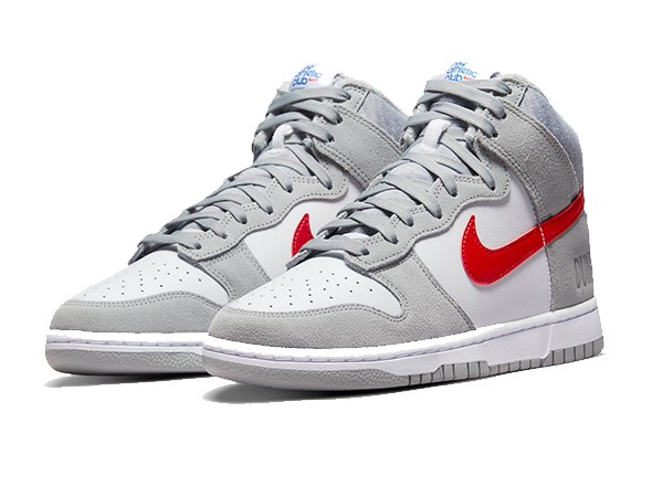 Details: Fake Nike Dunk High features a white leather base with grey suede overlays and red leather Swooshes on the sides. A terry cloth material is used on the collar, while having "DUNK" lettering on the lateral ankle. Retro-inspired Nike Athletic Club tongue tags and insoles atop a White midsole and Grey rubber outsole completes the design.