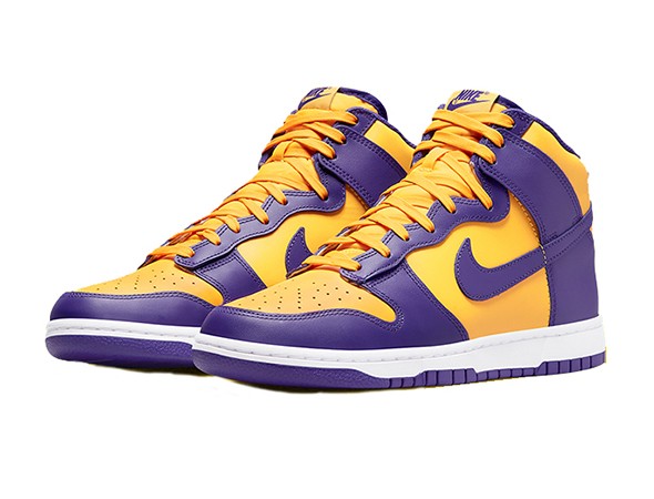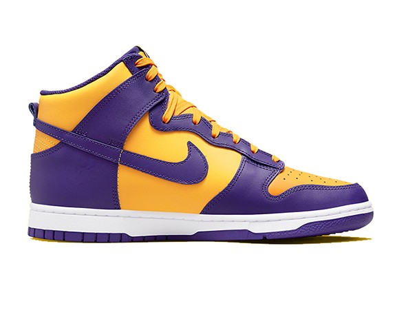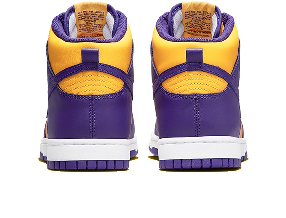 Details: Fake Nike Dunk High ”Lakers“ dressed in a UNiversity Gold, Court purple color scheme. Which celebrates the 17 times champions. the Swoosh turns to the iconic purple and gold palette to outfit the base, As usual, the tongues and insoles are decorated with Sportswear logos, and both of these are also fitted with Lakers-inspired hues. .