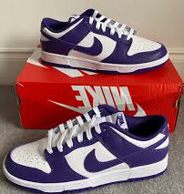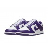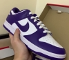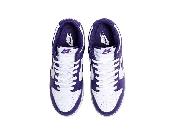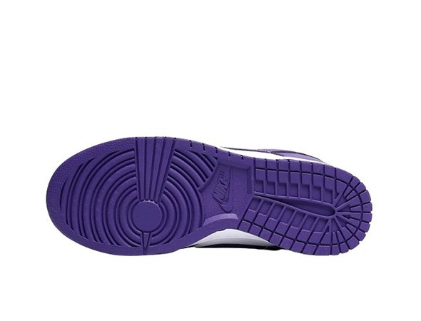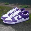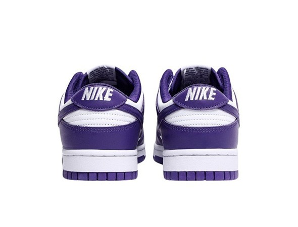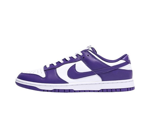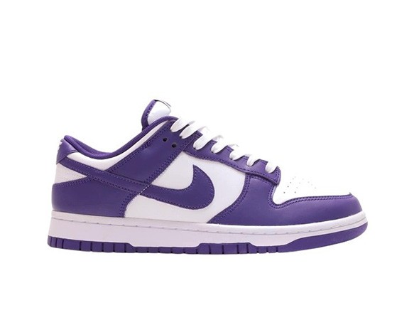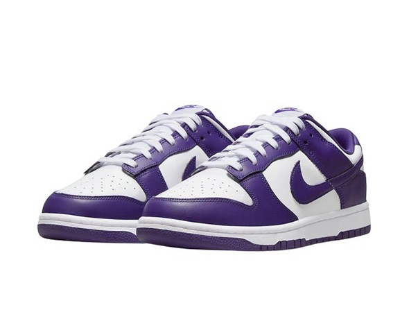 Details: This fake Nike dunk low shoes features a white leather upper with Championship Purple overlays and Swooshes.with white and purple sole.