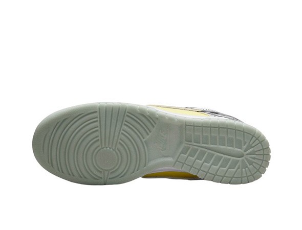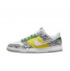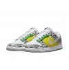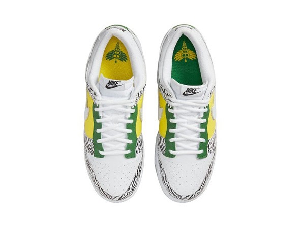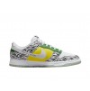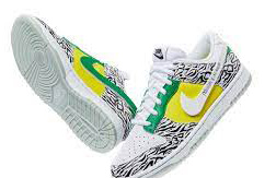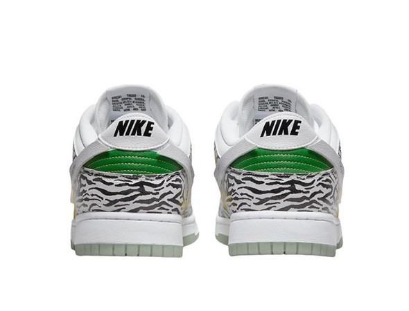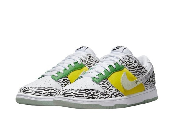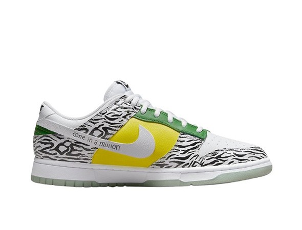 Details: This fake Nike dunk low shoes features a white and yellow leather upper with zebra patterned overlays and green eyestays. A white Swoosh with "One In A Million" text embossed on it wraps both sides of the upper.