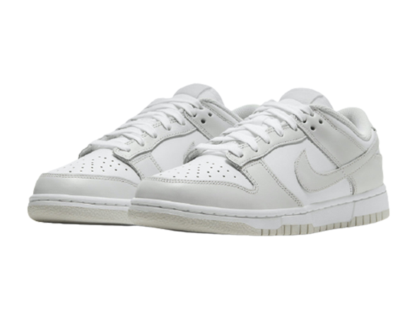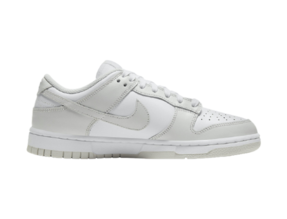Details: This fake Nike Dunk Low "Photon Dust" (W) features a White leather base with a light shade of Grey used on the overlays, Swooshes, heels, and rubber outsole. A White midsole and Black branding on the insoles completes the design.