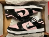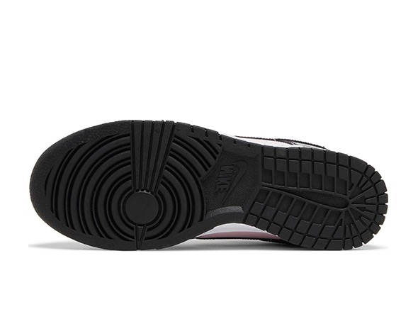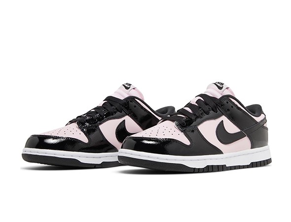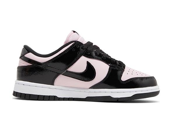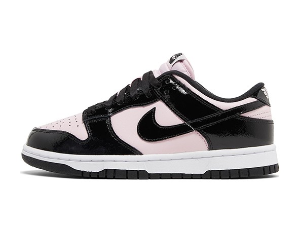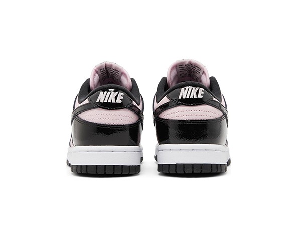 Details: Leather and patent leather materials are applied to this Fake Nike Dunk Low "Pink Foam Black". The base uses pink, while the overlays and Swoosh come in black. White midsole and black rubber outsole provide great cushioning and traction.