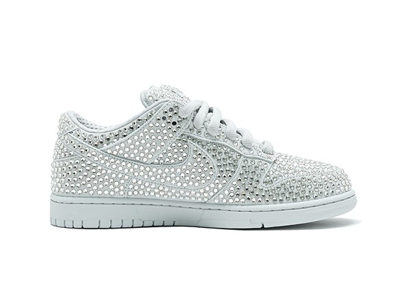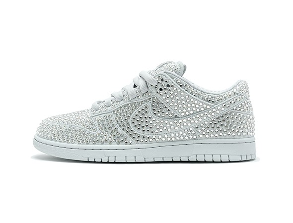 Details: The fake Nike Dunk Low CPFM "Pure Platinum" designed in partnership with the LA-based streetwear brand, delivers an opulent take on the classic silhouette. Every inch of the suede upper is entirely covered in Swarovski crystals, including the detachable double lace flaps, heavily padded tongue and oversized Swoosh, the latter borrowed from CPFM’s previous Nike Blazer collaboration from 2019.