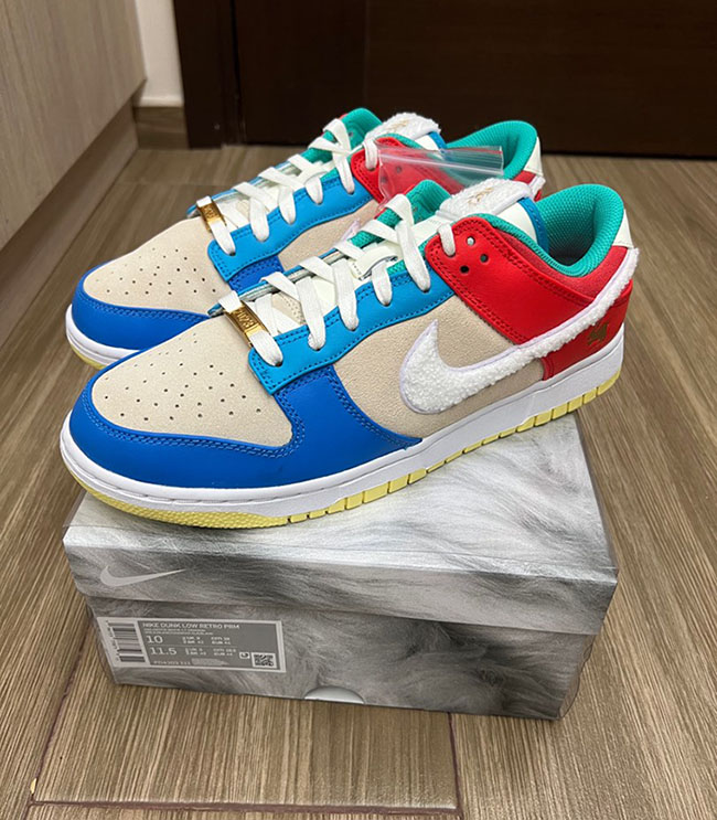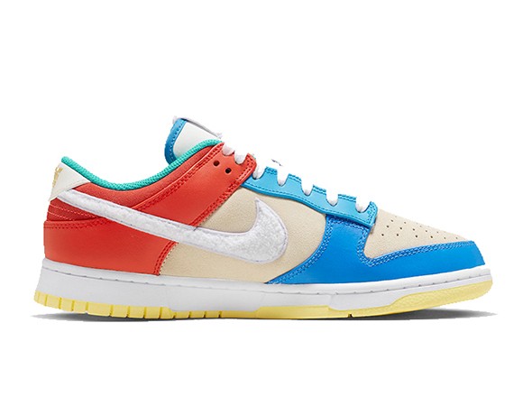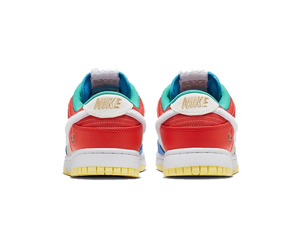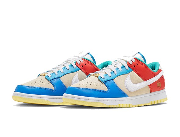 Details: UA Nike Dunk Low "Year of the Rabbit" is mainly constructed of premium suede and leather materials. The base is tan, while the overlays come in red and blue. White faux rabbit fur is applied to the Swoosh and tongue label. An adorable bunny graphic is printed on the side. White midsole and yellow rubber outsole support the upper.