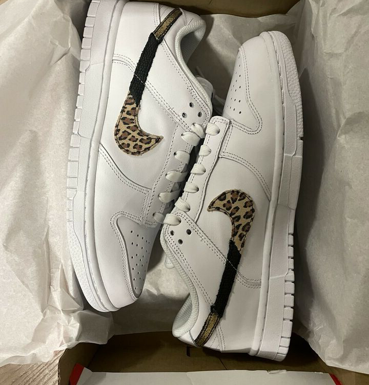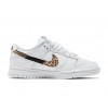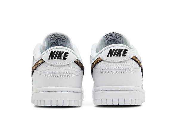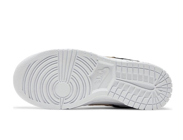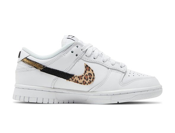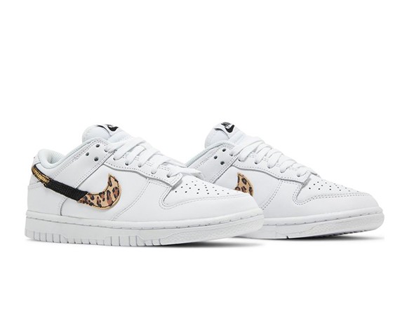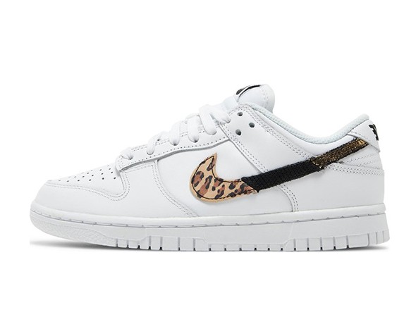 Details: This Nike Dunk Low SE "Primal White" replica details are smooth white leather upper and mixed material Swooshes that consist of cheetah print suede, black snakeskin-textured leather, and cracked metallic leather.