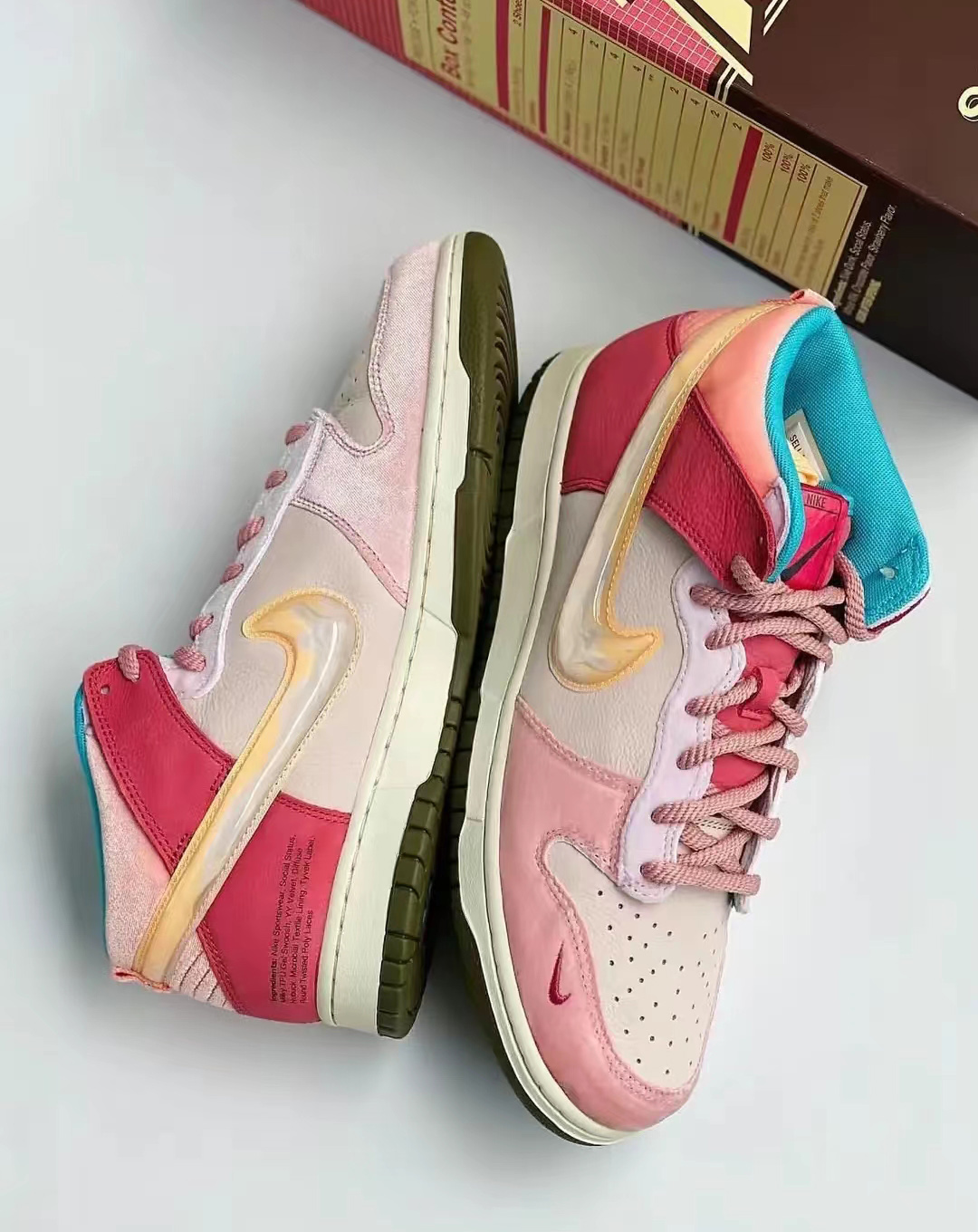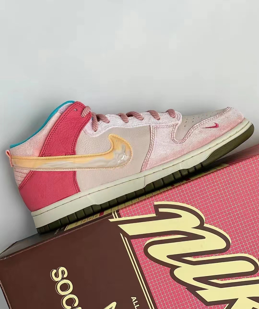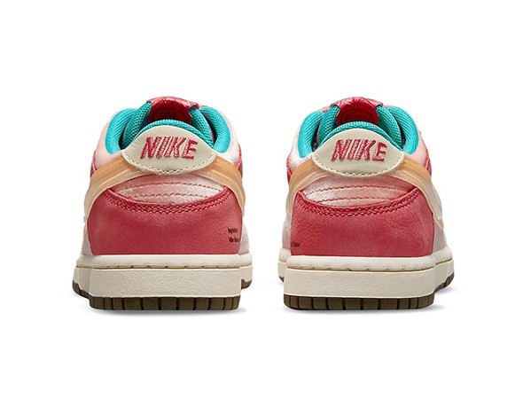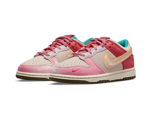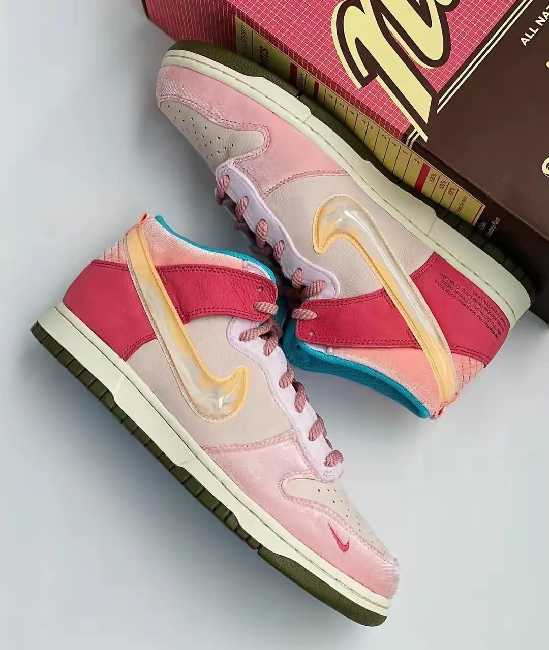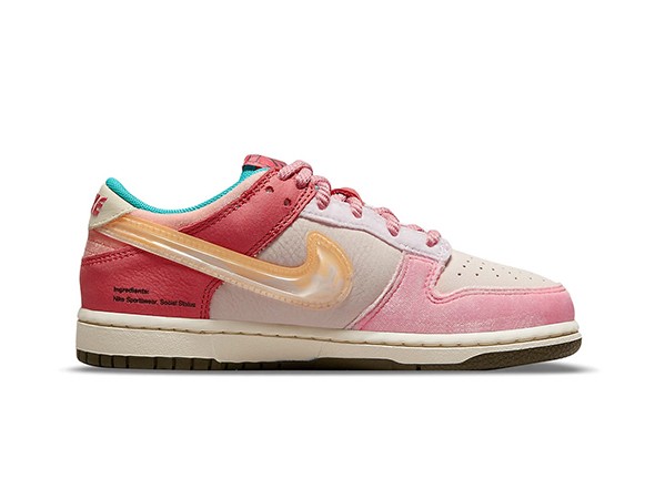 Details: Fake Social Status x Nike Dunk Low "Strawberry Milk" features a velour and leather build with slightly translucent, synthetic Swooshes.