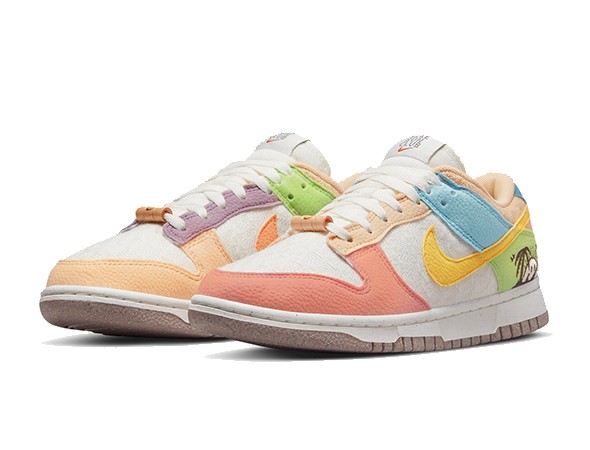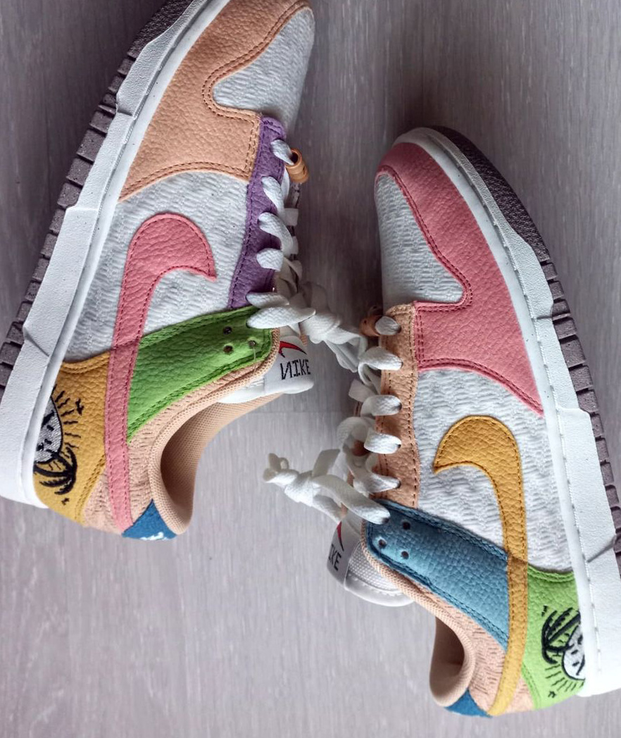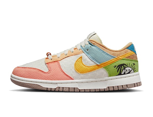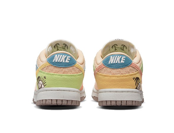 Details: This Fake Nike Dunk Low features a mix of mesh-like recycled textures with leather overlays and a palm trees under tags with a “Have A Nike Day”-style logo on the heels.