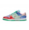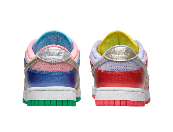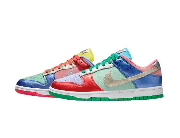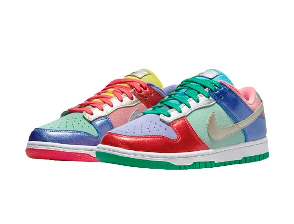 Details: This offering of the women's Nike Dunk Low Sunset Pulse fake comes dressed in a mismatched Multi-Color color blocking constructed in a mix of metallic leather and suede materials. Suede is used as the base while having shimmering leather overlays detailed with Silver Swooshes, heels, eyestays and tongue labels. The mismatched theme continues on the laces and rubber outsole atop a White midsole completes the design.