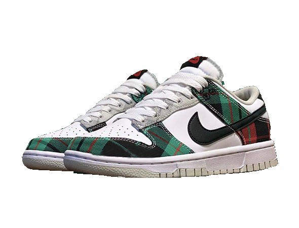 Details: This Fake Nike Dunk Low uses a white leather upper, while the Swoosh and heel tab are black. The two are in stark contrast. At the same time, the green and red tartan used on the overlay makes the whole pair more unique.