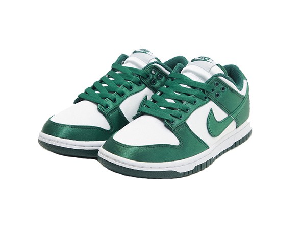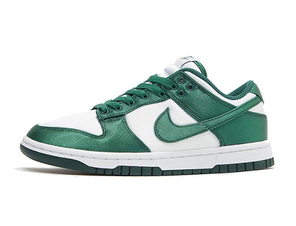 Details: Fake Nike Dunk Low WMNS "Satin Green" looks textured as it's made of an all-satin material. The base is white, while the overlays and Swoosh come in green. Two-tone sole provides great cushioning.