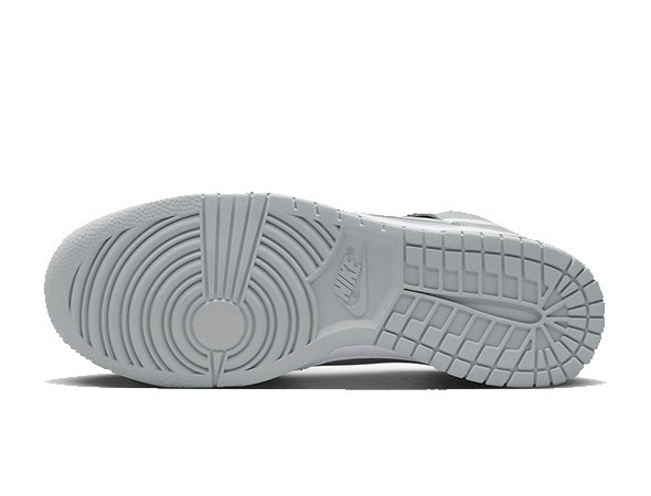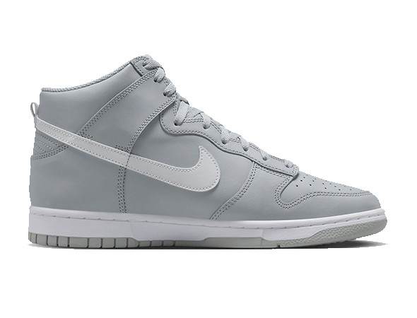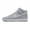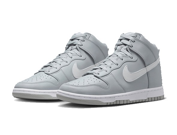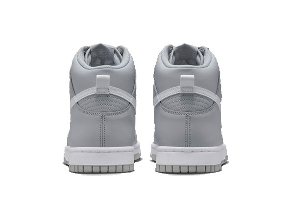 Details: Fake Nike Dunk High "Wolf Grey" is made of full leather material. Wolf grey upper with white Swooshes. The white midsole and grey rubber outsole match the upper.