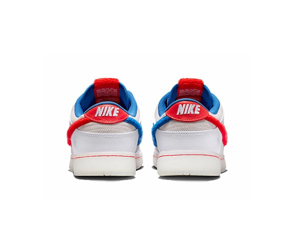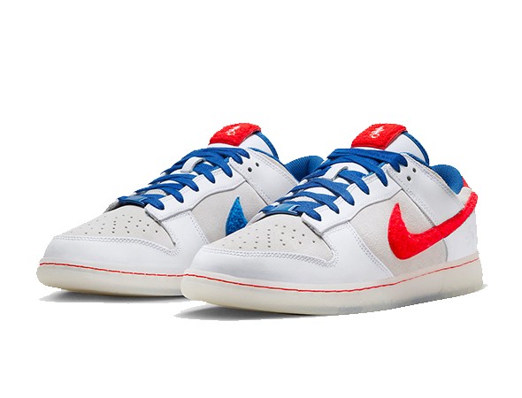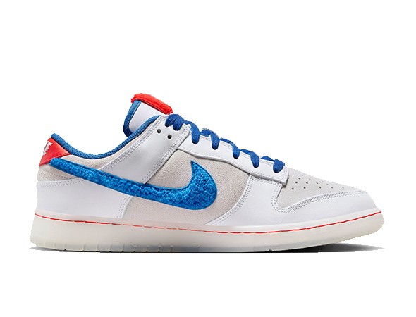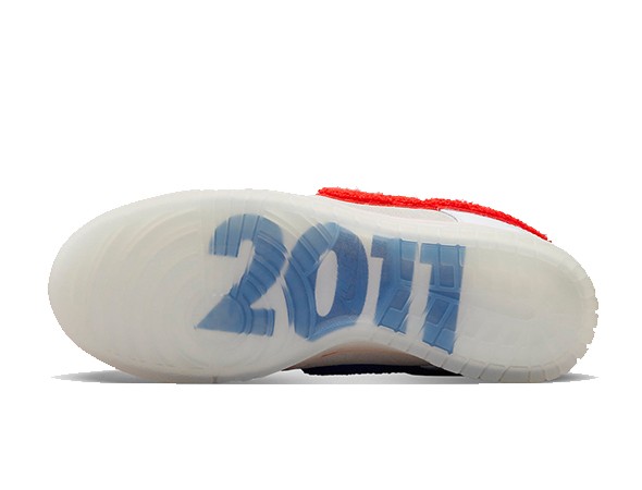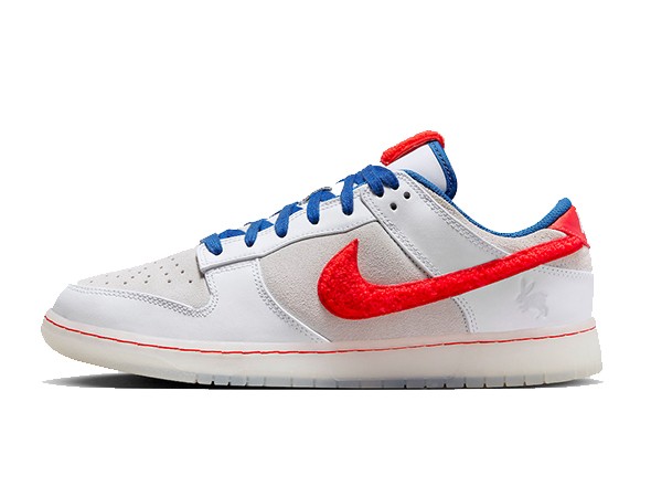 Details: The base of this Fake Nike Dunk Low is finished in Gray suede while the overlays are finished in White leather. The Swoosh is made of chenille material, but the color of the Swoosh on the inside and outside of the shoe is different. The outside is dark red and the inside is blue. Rabbit logo at outer heel. There are Chinese characters on the tongue. The years "2011" and "2023" are printed on the translucent outsole.