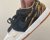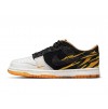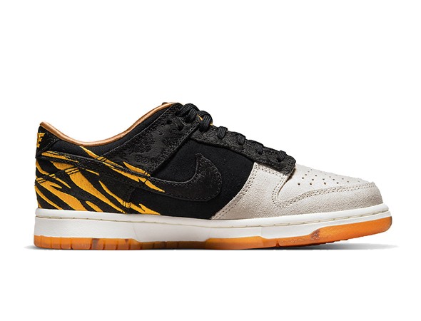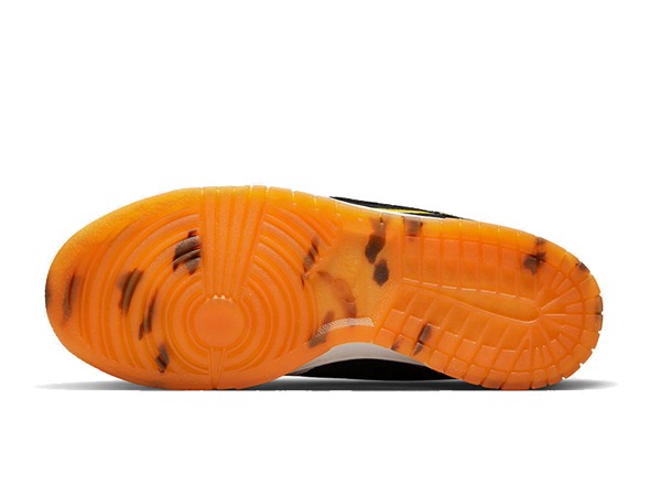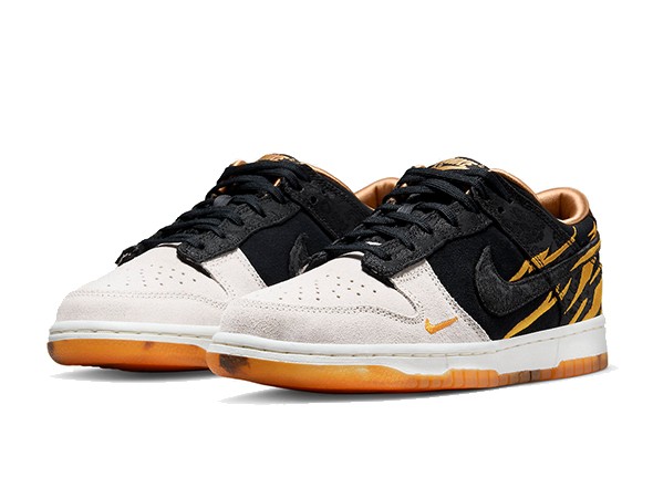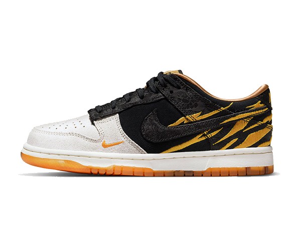 Details: This fake Nike dunk low shoes dressed in a Light grey/Black/Golden color scheme. The forefoot indulging in a light grey that contrasts the predominantly-black arrangement that appears from mid-foot to spine